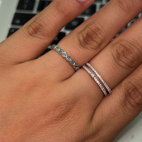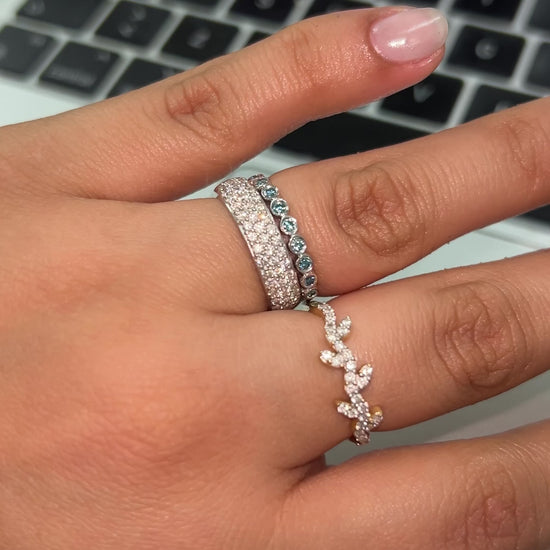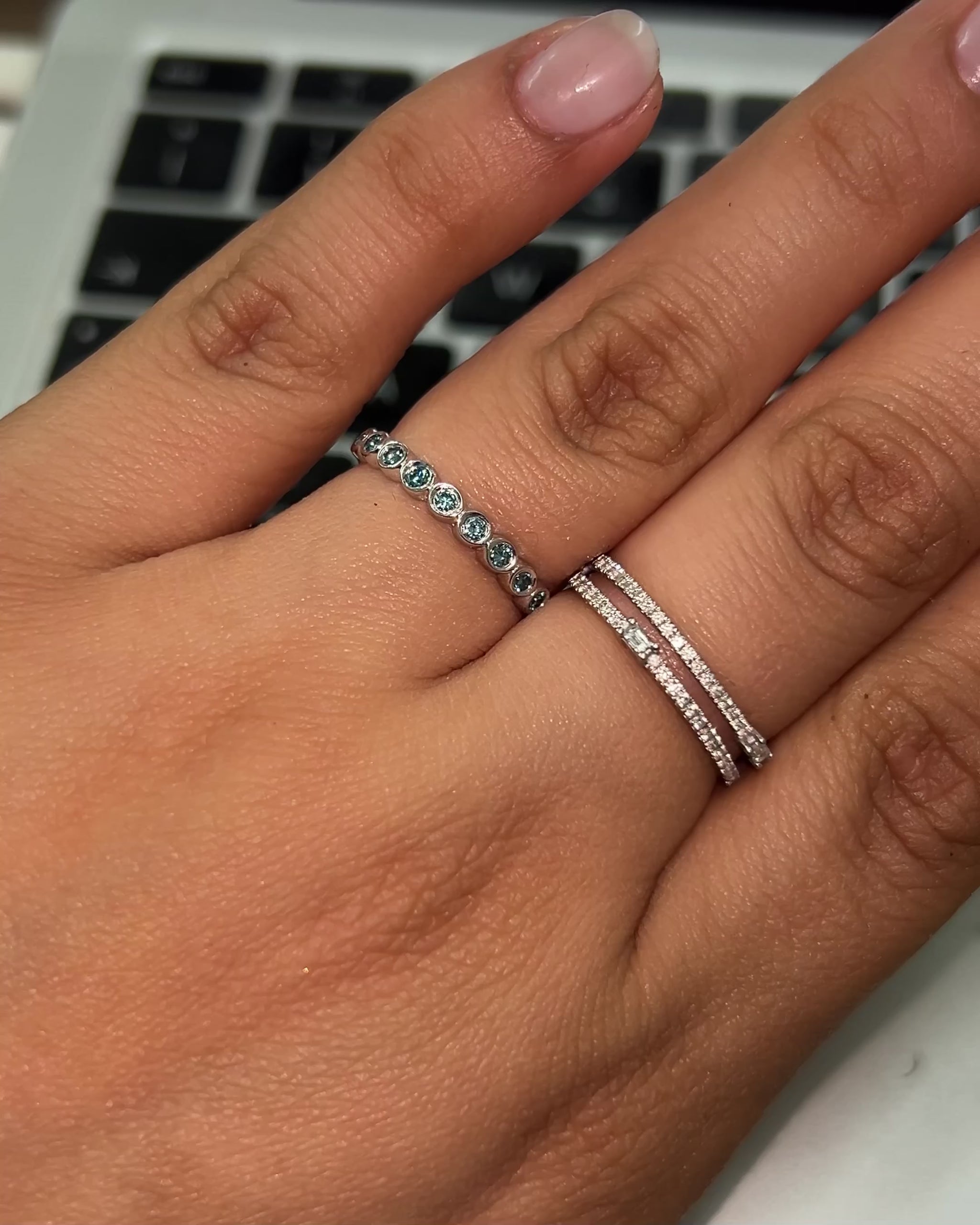 Anillo en oro blanco 14k que presenta nueve diamantes de laboratorio azules con acabado biselado. La técnica de biselado resalta el brillo y la claridad de cada piedra, generando un efecto visual cautivador. Los diamantes de laboratorio ofrecen la misma resistencia y transparencia que sus contrapartes naturales. Una pieza contemporánea que funciona tanto para ocasiones formales como para uso diario, con un toque de color que la distingue.