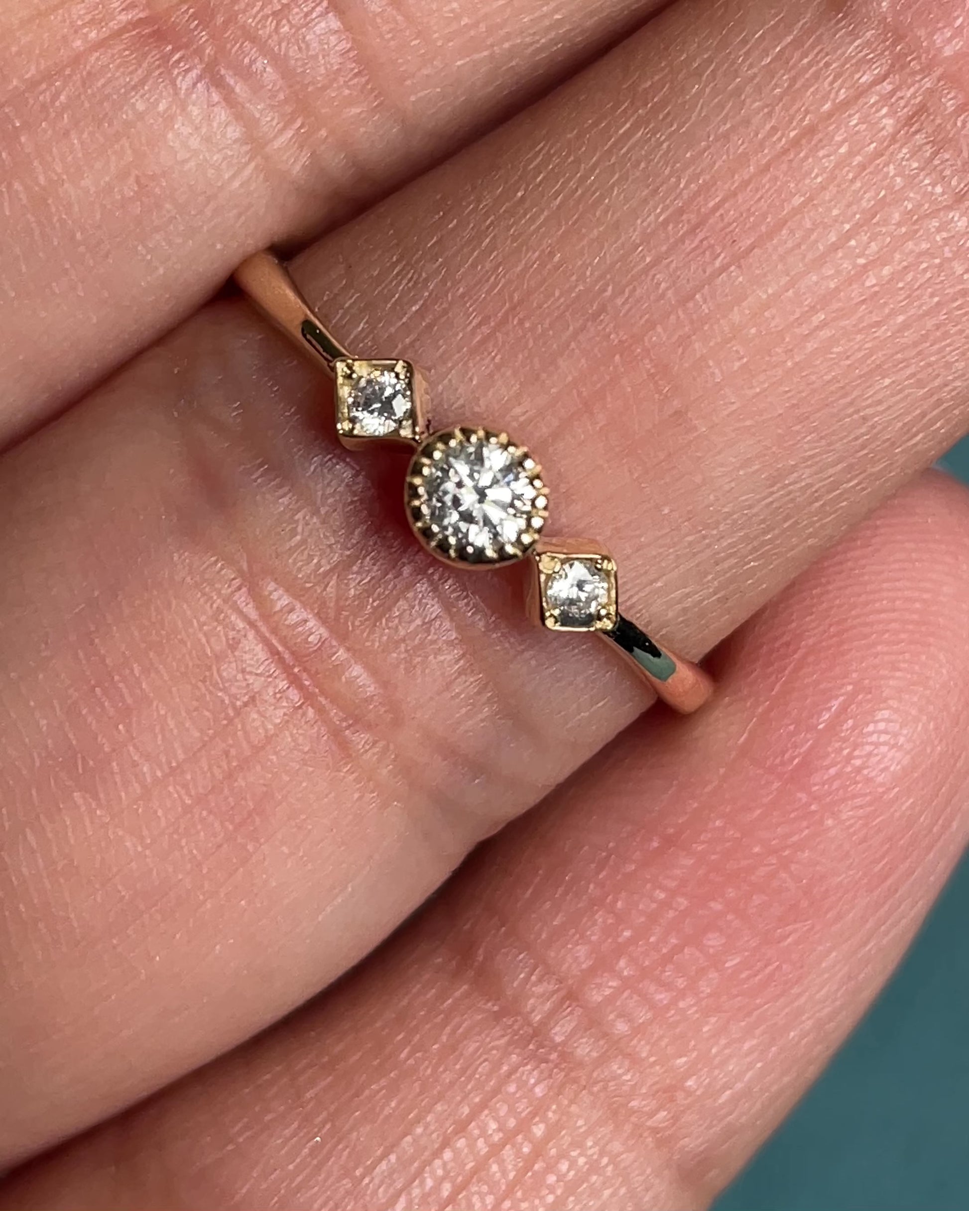 Anillo de oro de 14 quilates con un diamante central de 0.10 quilates y dos diamantes laterales de 0.02 quilates cada uno. Este diseño clásico combina elegancia y brillo, perfecto para ocasiones especiales o como pieza de joyería diaria. El oro de 14k ofrece durabilidad y resistencia, mientras que los diamantes añaden un toque de sofisticación y luminosidad a tu look.