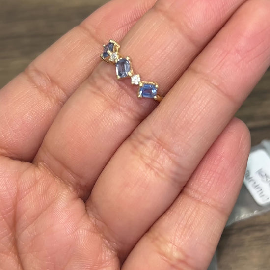 Anillo de oro 14k que combina elegancia y sofisticación. Presenta tres zafiros azules con corte esmeralda, acompañados por dos diamantes redondos que realzan su brillo. Diseño clásico y versátil, perfecto para ocasiones especiales o para lucir día a día. Una pieza de joyería que destaca por su calidad y belleza atemporal.