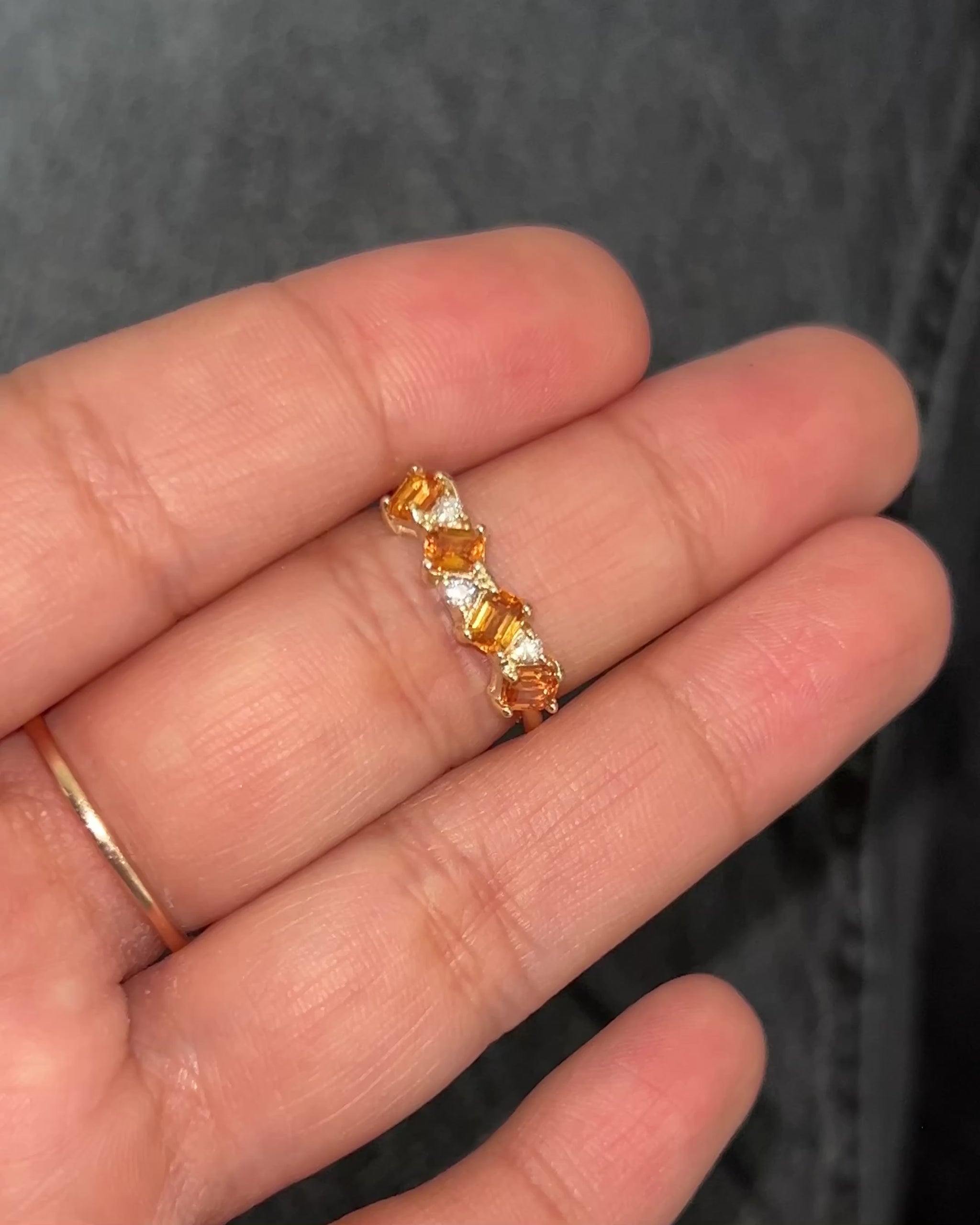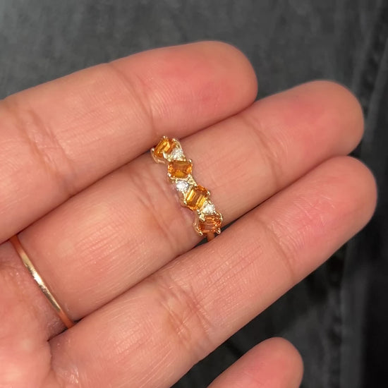 Anillo de oro de 14k que combina cuatro zafiros naranjas corte esmeralda con tres diamantes redondos brillantes. Un diseño sofisticado que destaca por la calidez de los zafiros y el brillo clásico de los diamantes, perfecto para ocasiones especiales o como pieza de joyería versátil.