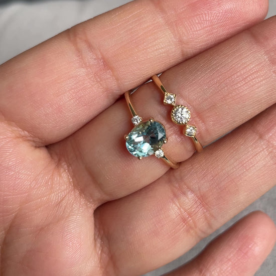 Anillo elaborado en oro de 14k que presenta un topacio con corte oval en el centro, acompañado por dos diamantes redondos a cada lado. El diseño de tres piedras proporciona equilibrio visual y permite que cada gema destaque por sus características individuales. El oro de 14k ofrece durabilidad y resistencia, mientras que la combinación de topacio y diamantes crea una pieza versátil adecuada para diferentes ocasiones y estilos personales.