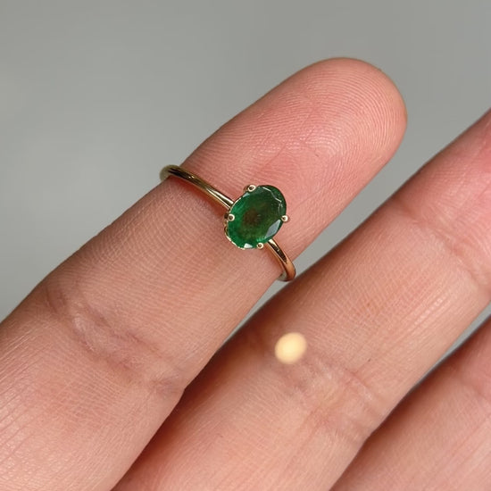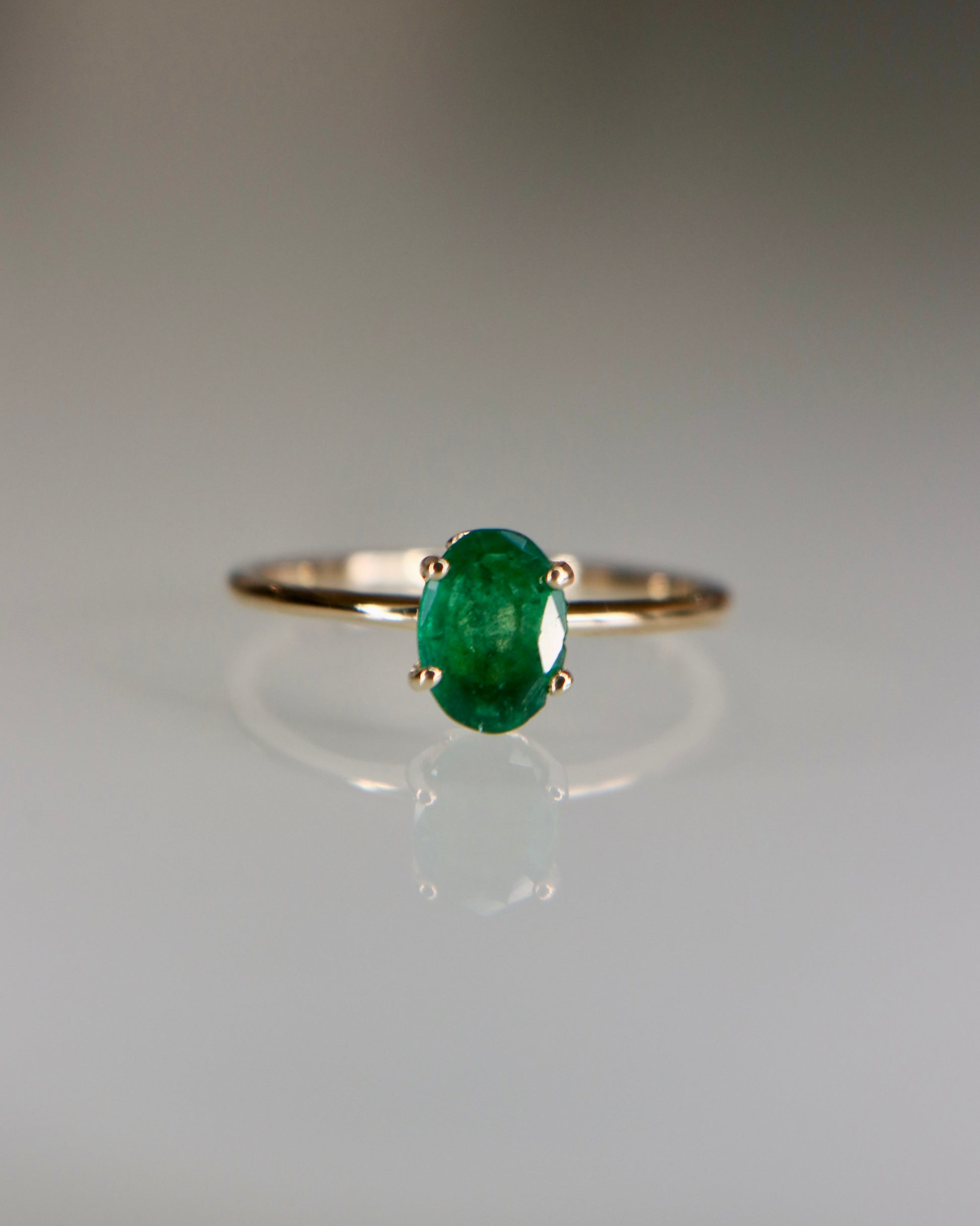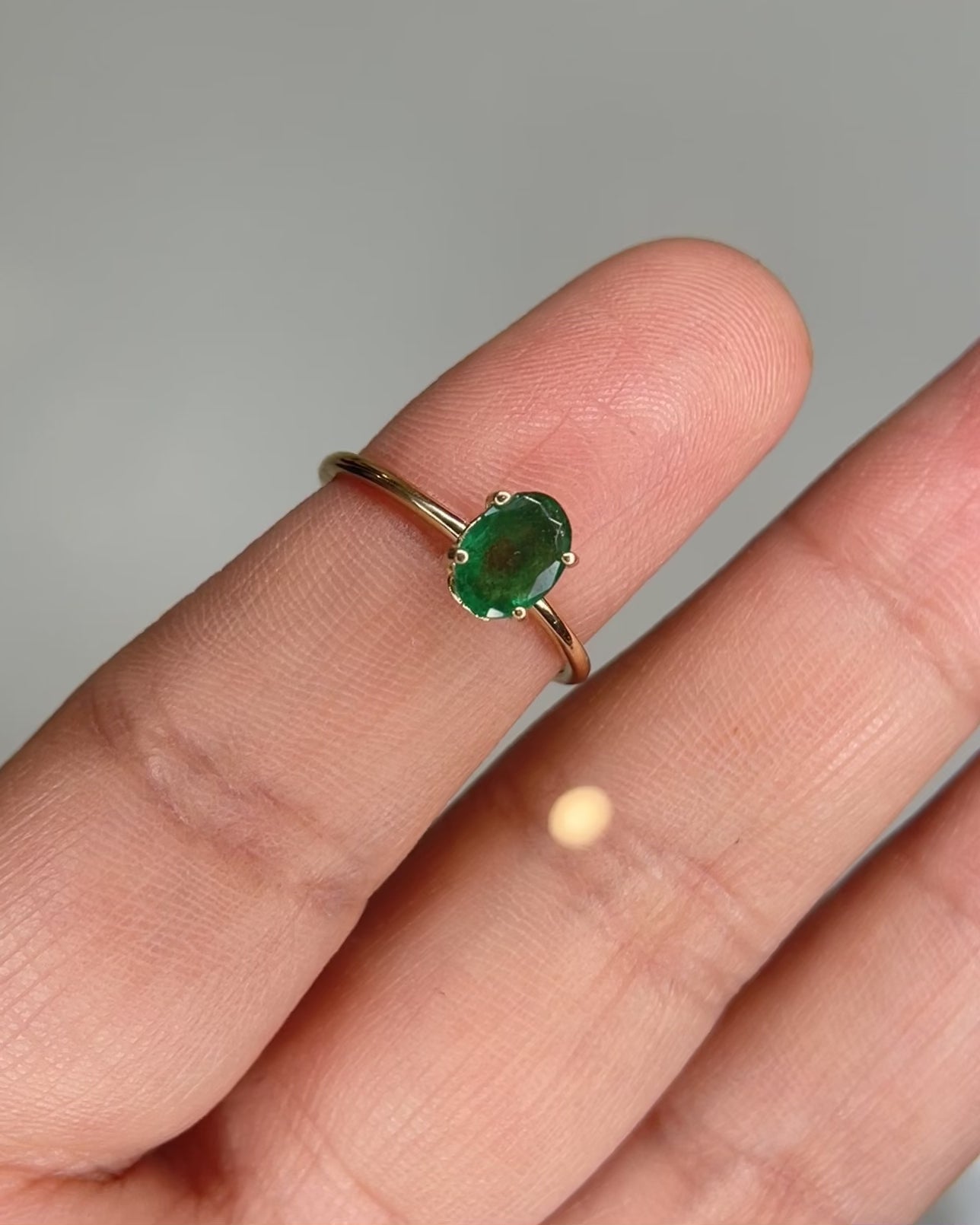 Anillo de oro 14k que combina elegancia y significado. Presenta una esmeralda oval como piedra central, acompañada de un delicado corazón integrado en la montadura. El diseño solitario destaca la belleza natural de la esmeralda, mientras que el detalle del corazón añade un toque romántico y personalizado. Ideal para ocasiones especiales o como símbolo de amor duradero.